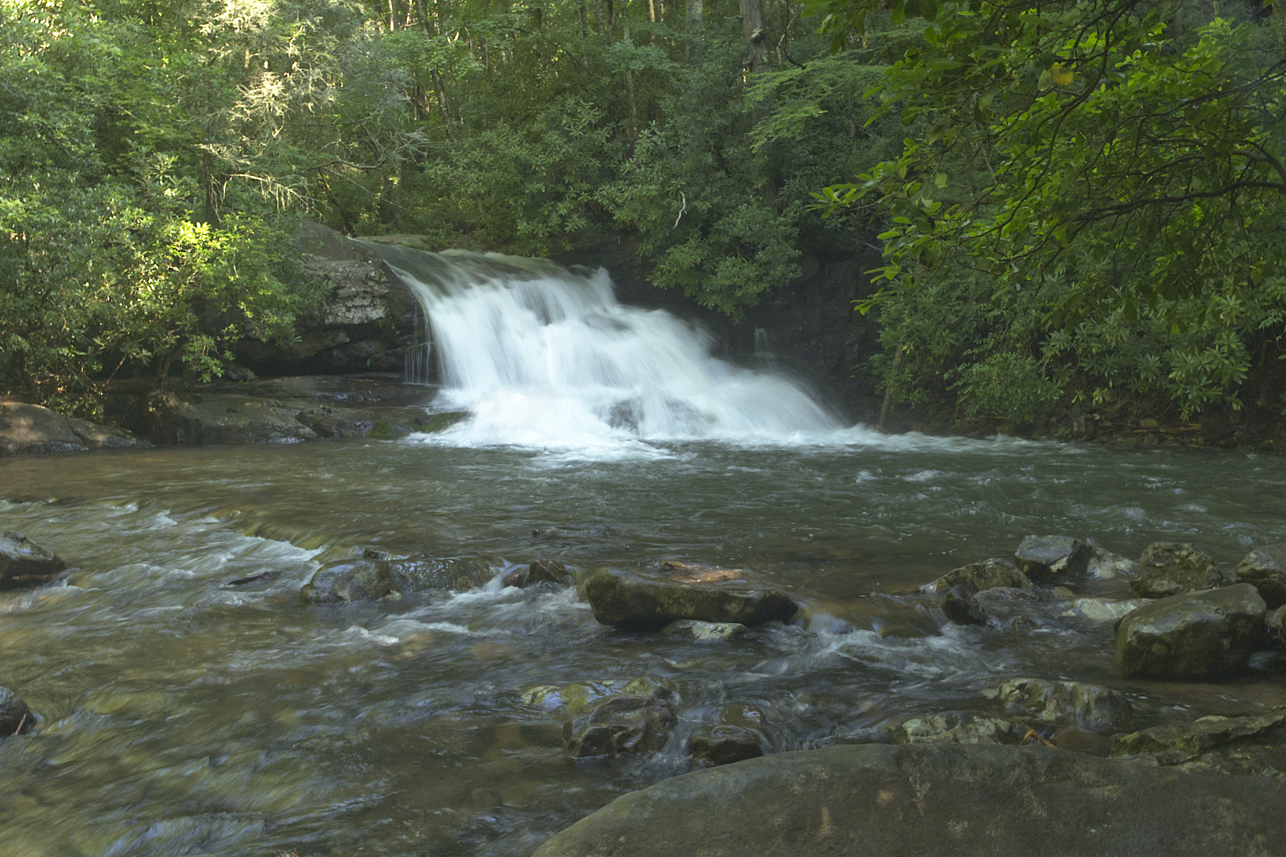 Most of the time, the pool below the falls is placid and suitable for wading/swimming. This day it was wild and none of us chose to venture into the water. So we shot from behind or on the logs bordering the pool. In addition, I turned around and tried some Intentional Camera Movement (ICM) shots of the trees and leaves. On the way back to the truck, I stopped couple of times to snap the creek below the falls. The creek is getting quite overgrown and it is now much more difficult to get good pictures without shooting through the rhododendron foliage. Perhaps int he fall…..